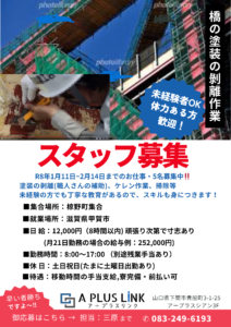 ★ 作業スタッフ募集 ★ 2025年4月25日 最終更新日時 : 2025年7月18日 管理者 令和7年7月からのお仕事です! 橋の塗装の剥離作業(職人さんの補助)と周辺の清掃 丁寧な指導があるので安心(^^)v 未経験でも体力ある方、稼ぎたい方大歓迎です! お早めのご応募お待ちしております↓ ℡:083-249-6193 Follow me! FacebookXBlueskyHatenaCopy