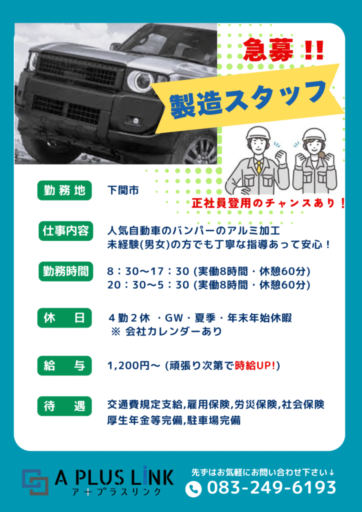 【急募】★男女製造スタッフ★ 未経験者OK! 2025年11月4日 最終更新日時 : 2025年11月4日 管理者 正社員登用のチャンスある工場求人出ました! 丁寧な指導あるので、未経験の方でも大丈夫(^_-)v ガッツリ稼げますよ~ 先ずはお気軽にお問い合わせお待ちしております(^^)/ ↓ ↓ ↓ TEL:083-249-6193 Follow me! FacebookXBlueskyHatenaCopy