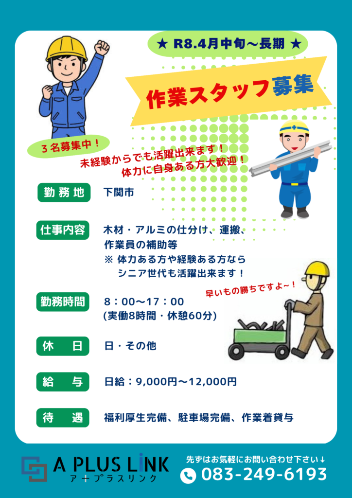 【R8.4月中旬~3名募集】★ 作業スタッフ募集 ★